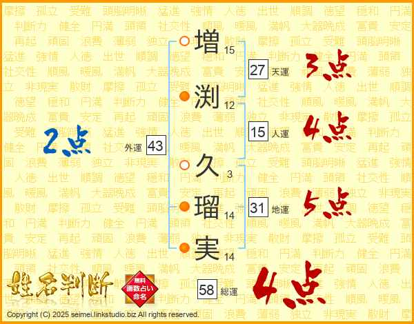 増(15画)渕(12画) 久(3画)瑠(14画)実(14画)