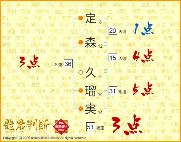 定(8画)森(12画) 久(3画)瑠(14画)実(14画)