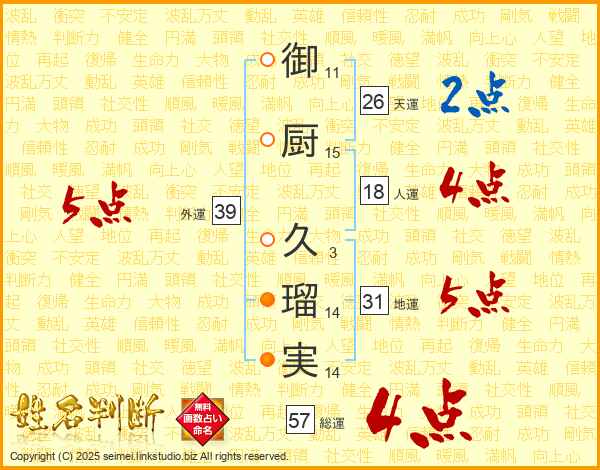 御(11画)厨(15画) 久(3画)瑠(14画)実(14画)