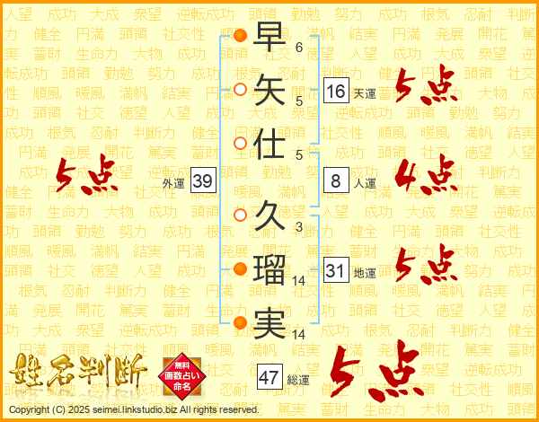 早(6画)矢(5画)仕(5画) 久(3画)瑠(14画)実(14画)
