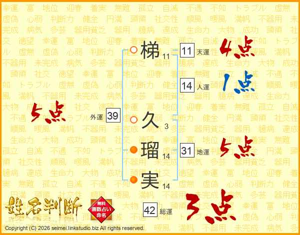 梯(11画) 久(3画)瑠(14画)実(14画)