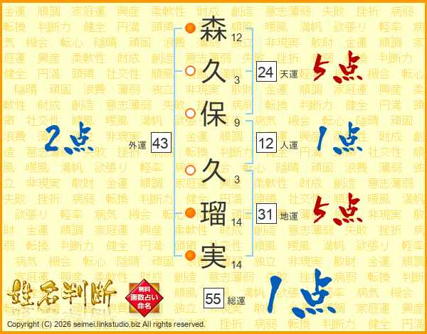 森(12画)久(3画)保(9画) 久(3画)瑠(14画)実(14画)