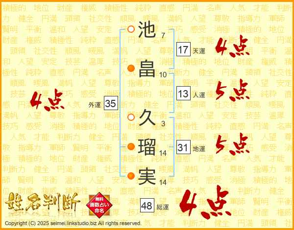 池(7画)畠(10画) 久(3画)瑠(14画)実(14画)