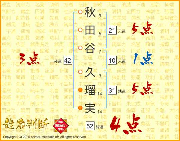 秋(9画)田(5画)谷(7画) 久(3画)瑠(14画)実(14画)