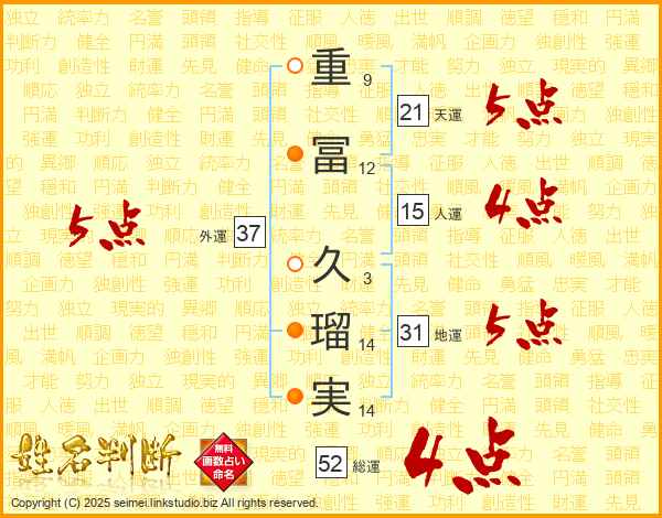 重(9画)冨(12画) 久(3画)瑠(14画)実(14画)