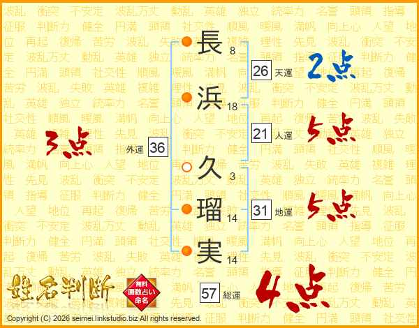 長(8画)浜(18画) 久(3画)瑠(14画)実(14画)