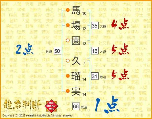 馬(10画)場(12画)園(13画) 久(3画)瑠(14画)実(14画)
