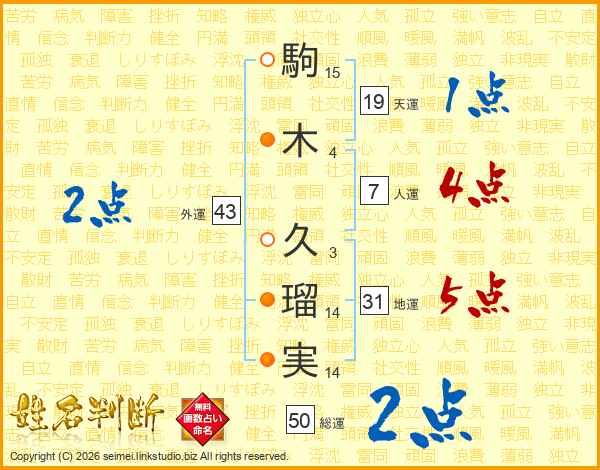 駒木久瑠実さんの外運は43画の2点!