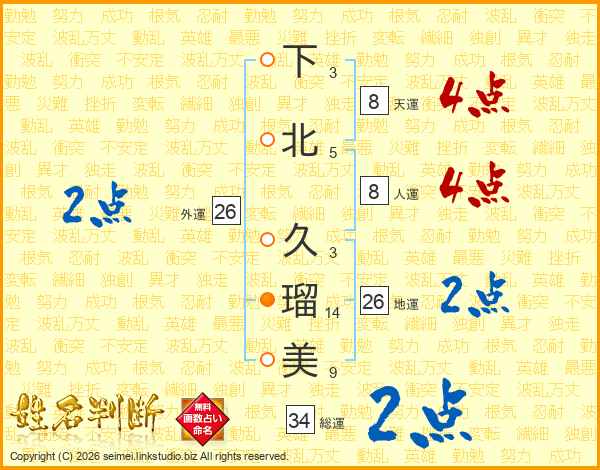 下(3画)北(5画) 久(3画)瑠(14画)美(9画)