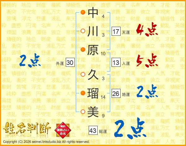 中川原久瑠美さんの人運は13画の5点!