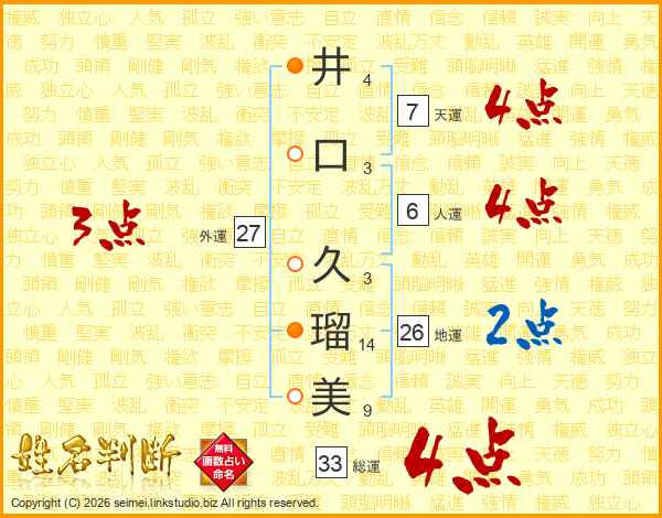 井(4画)口(3画) 久(3画)瑠(14画)美(9画)