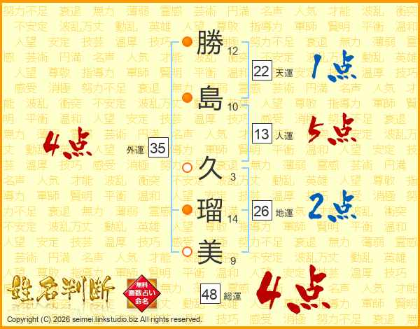 勝(12画)島(10画) 久(3画)瑠(14画)美(9画)