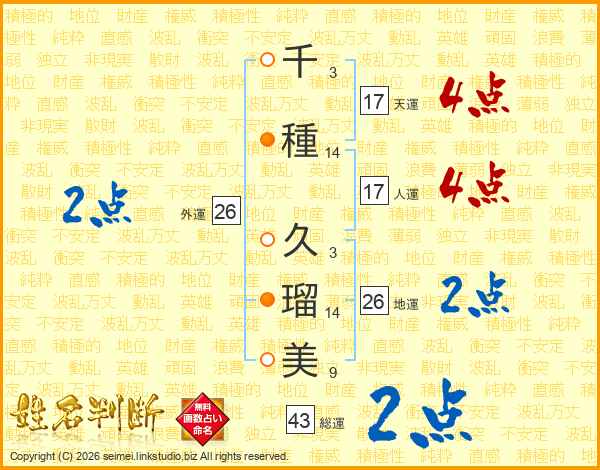 千(3画)種(14画) 久(3画)瑠(14画)美(9画)