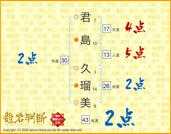 君(7画)島(10画) 久(3画)瑠(14画)美(9画)