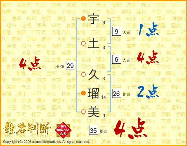 宇(6画)土(3画) 久(3画)瑠(14画)美(9画)