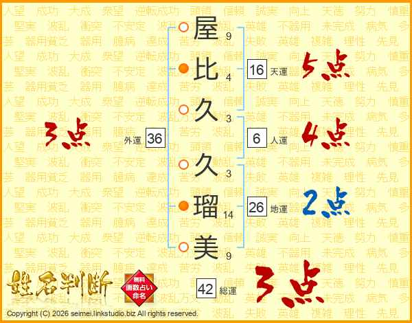 屋(9画)比(4画)久(3画) 久(3画)瑠(14画)美(9画)