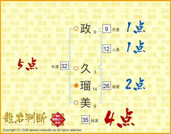 政(9画) 久(3画)瑠(14画)美(9画)
