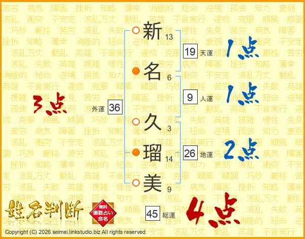 新(13画)名(6画) 久(3画)瑠(14画)美(9画)