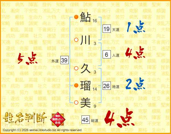 鮎(16画)川(3画) 久(3画)瑠(14画)美(9画)