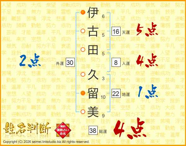 伊(6画)古(5画)田(5画) 久(3画)留(10画)美(9画)