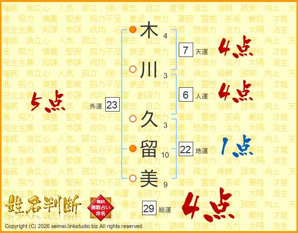 木(4画)川(3画) 久(3画)留(10画)美(9画)
