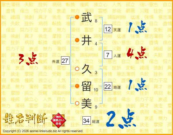 武(8画)井(4画) 久(3画)留(10画)美(9画)