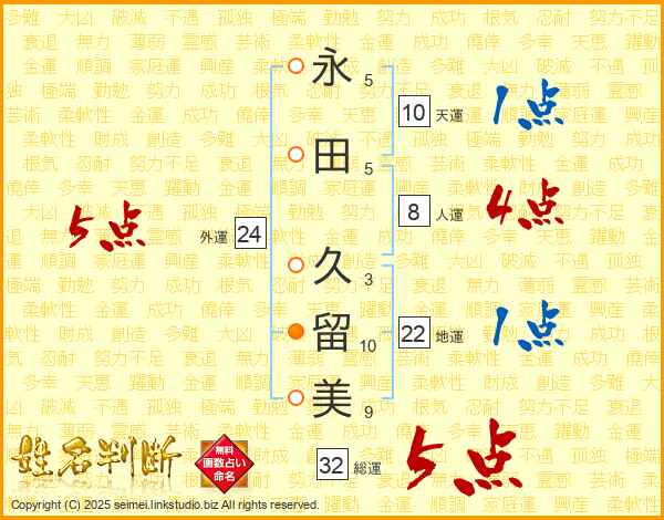 永(5画)田(5画) 久(3画)留(10画)美(9画)