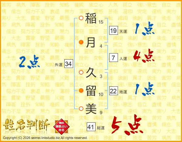 稲(15画)月(4画) 久(3画)留(10画)美(9画)