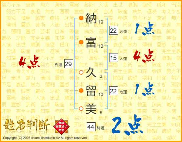 納(10画)富(12画) 久(3画)留(10画)美(9画)