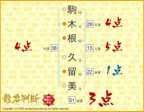 駒(15画)木(4画)根(10画) 久(3画)留(10画)美(9画)