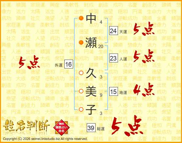 中瀬久美子さんの総運は39画の5点!