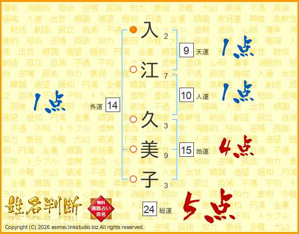 入(2画)江(7画) 久(3画)美(9画)子(3画)
