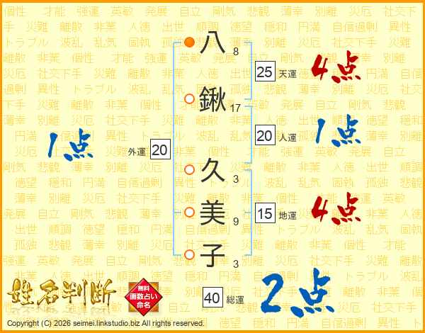 八(8画)鍬(17画) 久(3画)美(9画)子(3画)