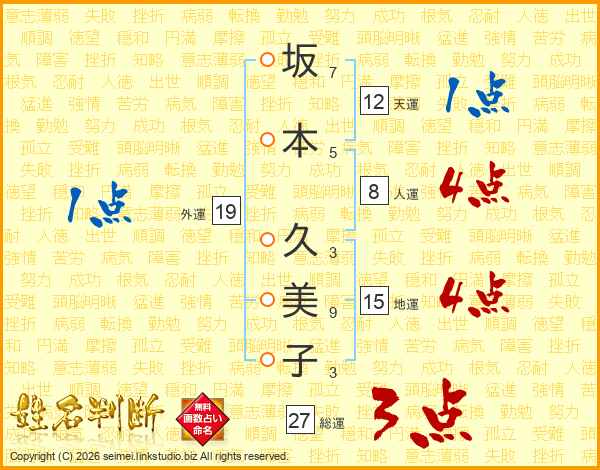 坂(7画)本(5画) 久(3画)美(9画)子(3画)