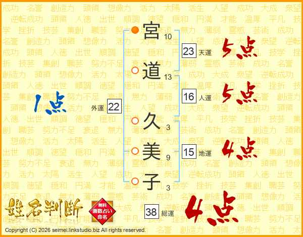 宮(10画)道(13画) 久(3画)美(9画)子(3画)