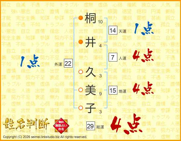 桐(10画)井(4画) 久(3画)美(9画)子(3画)