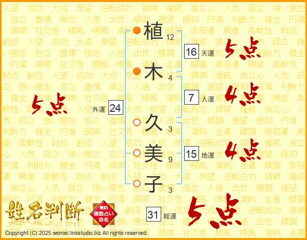 植(12画)木(4画) 久(3画)美(9画)子(3画)