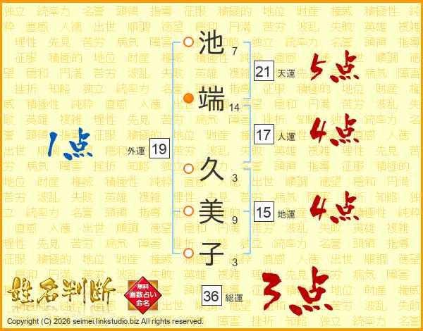 池(7画)端(14画) 久(3画)美(9画)子(3画)
