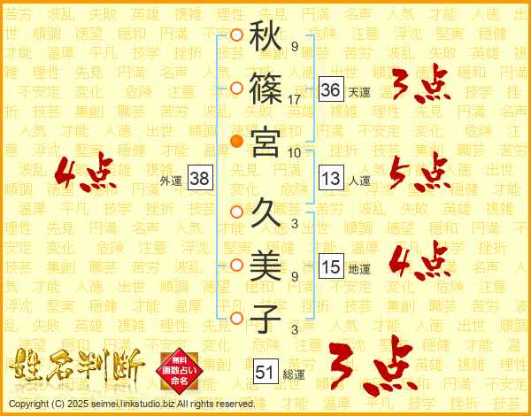 秋(9画)篠(17画)宮(10画) 久(3画)美(9画)子(3画)