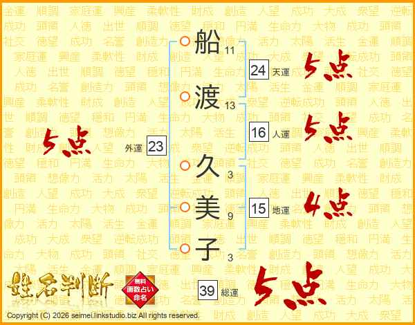 船(11画)渡(13画) 久(3画)美(9画)子(3画)