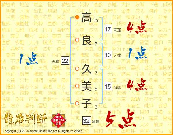 高(10画)良(7画) 久(3画)美(9画)子(3画)