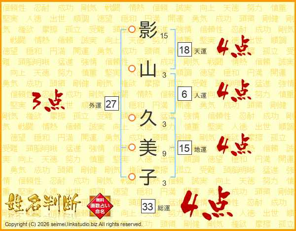 影(15画)山(3画) 久(3画)美(9画)子(3画)