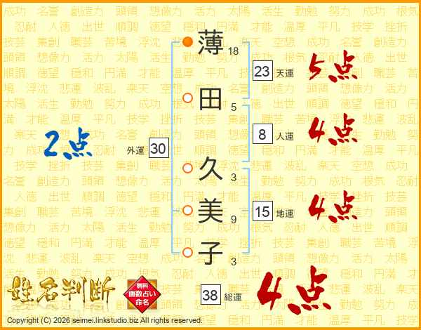 薄(18画)田(5画) 久(3画)美(9画)子(3画)