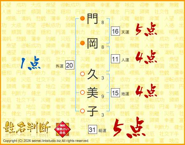 門岡久美子さんの総運は31画の5点!
