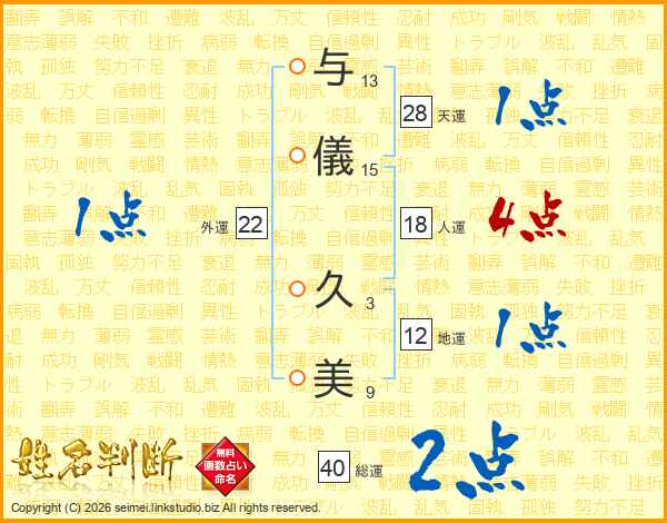 画数の奇数(○陽)と偶数(●陰)の配列で吉凶を占います。どちらかにかたよる名前は大凶名で避ける必要があります。画数の奇数偶数。