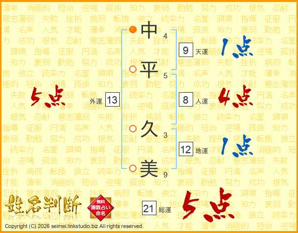 生活面を象徴する運勢です。外部から受ける影響力を表し、結婚運、家庭運や職場、環境への順応性を表します。総運から人運を引いた画数。姓や名が1文字の場合を除く。