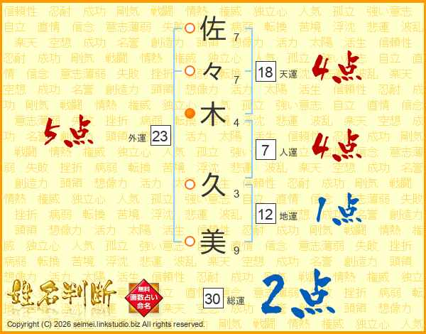 佐(7画)々(7画)木(4画) 久(3画)美(9画)