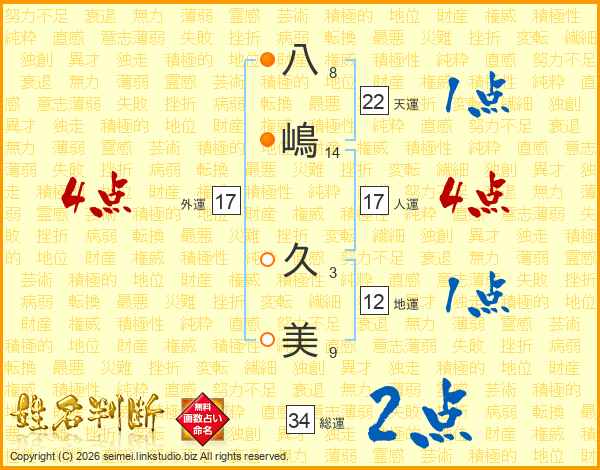 画数の奇数(○陽)と偶数(●陰)の配列で吉凶を占います。どちらかにかたよる名前は大凶名で避ける必要があります。画数の奇数偶数。