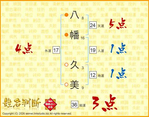 八(8画)幡(16画) 久(3画)美(9画)
