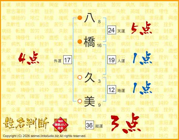八(8画)橋(16画) 久(3画)美(9画)